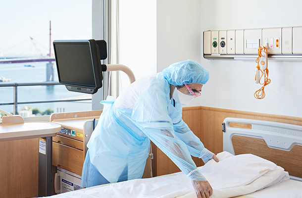 6東病棟は、緊急入院患者さんと感染症の患者さんが対象の病棟です。コロナが流行してから院内では感染防止のため面会制限を行っています。患者さんの中には急な入院となり不安を抱えている人も多くおられます。不安なく療養生活を送っていただけるように、毎朝一番に医師と患者カンファレンスを行って患者さんの状態を共有して安心できる関わりを行えるようにしています。そして繁雑な中でも安全な看護が提供できるように、スタッフ間で声をかけあい、コミュニケーションがとれるように意識しています。いろんなことを相談しあって患者さんに関わるようにしています。みんなで病棟目標の「特殊な環境下で療養生活を送る患者さんの苦痛を軽減する看護」「院内感染を発生させない安心できる看護」ができるように頑張っています。